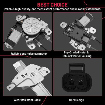 【Premium Quality】 This window regulator and motor assembly feature significant enhancements over the factory part, providing a higher level of reliability. It incorporates tension springs to effectively resist cable reel binding caused by prolonged use. Additionally, it is equipped with advanced cable guides to eliminate high cable tension and reduce cable stress.