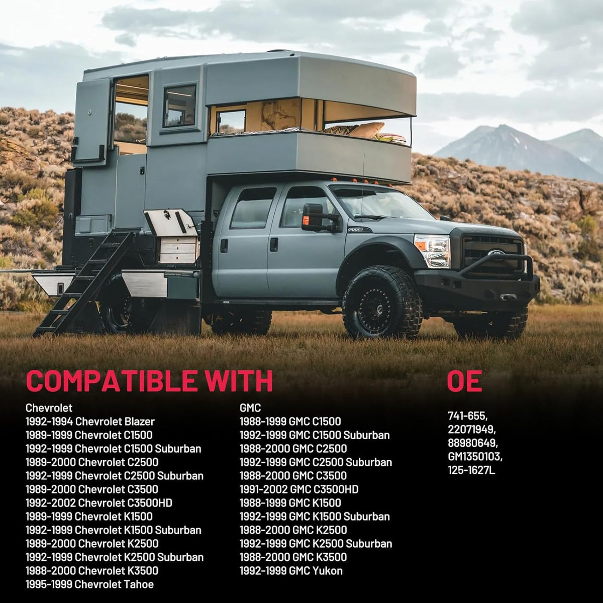 【Compatible Vehicles】 For 1988-1999 GMC C1500, 1992-1999 GMC C1500 Suburban, 1988-2000 GMC C2500, 1992-1999 GMC C2500 Suburban, 1988-2000 GMC C3500, 1999-2002 GMC C3500HD, 1988-1999 GMC K1500, 1992-1999 GMC K1500 Suburban, 1988-2000 GMC K2500, 1992-1999 GMC K2500 Suburban, 1988-2000 GMC K3500, 1992-1994 Chevrolet Blazer, 1989-1999 Chevrolet C1500, 1992-1999 Chevrolet C1500 Suburban, 1989-2000 Chevrolet C2500, 1992-1999 Chevrolet C2500 Suburban, 1989-2000 Chevrolet C3500, 1992-2002 Chevrolet C3500HD, 1989-1999 Chevrolet K1500, 1992-1999 Chevrolet K1500 Suburban, 1989-2000 Chevrolet K2500, 1992-1999 Chevrolet K2500 Suburban, 1988-2000 Chevrolet K3500, 1995-1999 Chevrolet Tahoe