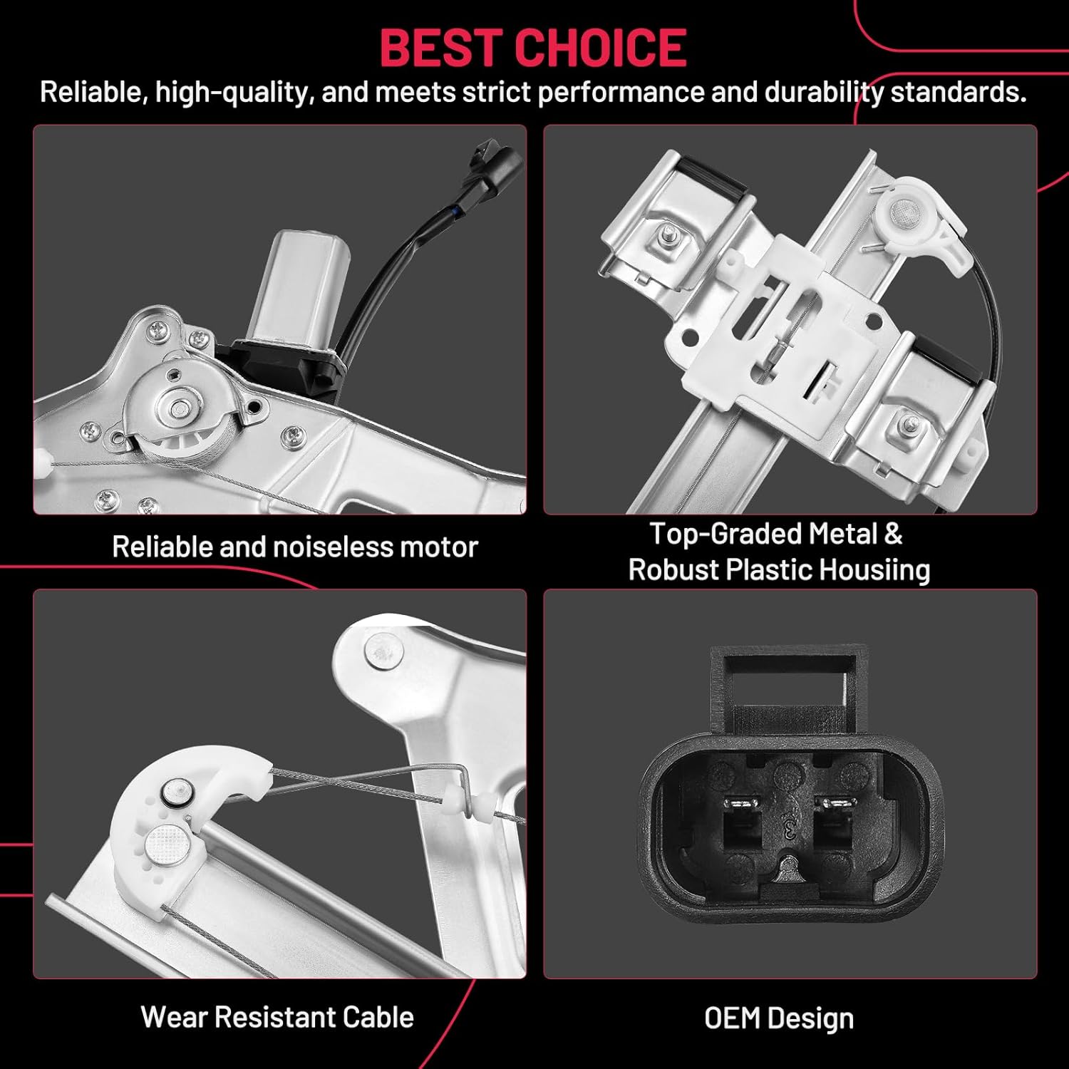 【Premium Quality】 This window regulator and motor assembly feature significant enhancements over the factory part, providing a higher level of reliability. It incorporates tension springs to effectively resist cable reel binding caused by prolonged use. Additionally, it is equipped with advanced cable guides to eliminate high cable tension and reduce cable stress.