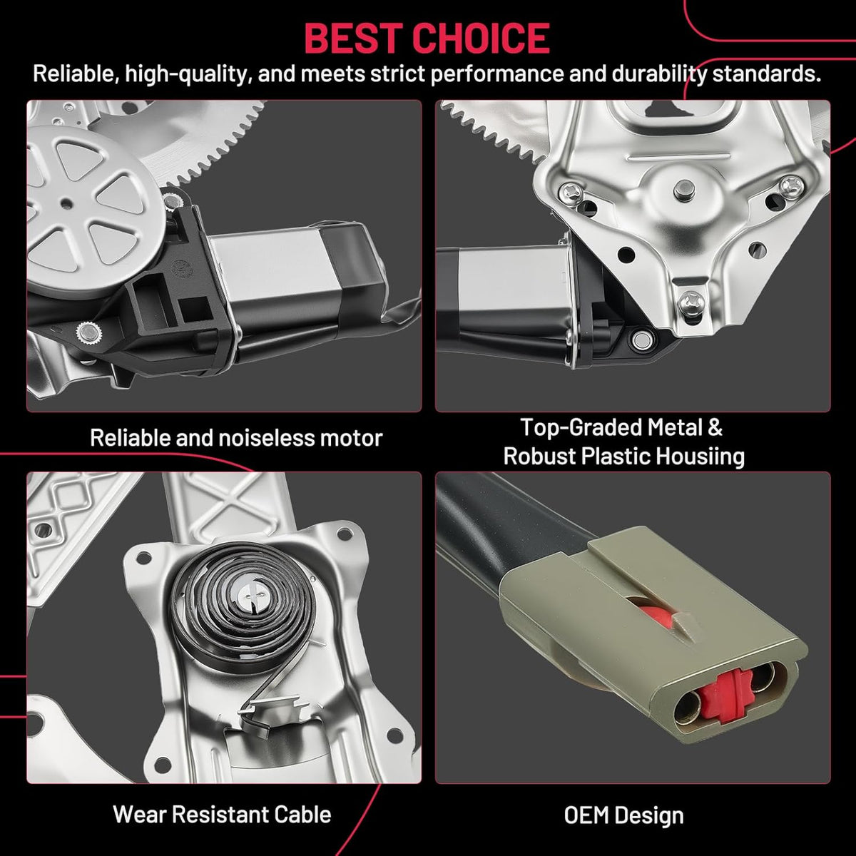 【Premium Quality】 This window regulator and motor assembly feature significant enhancements over the factory part, providing a higher level of reliability. It incorporates tension springs to effectively resist cable reel binding caused by prolonged use. Additionally, it is equipped with advanced cable guides to eliminate high cable tension and reduce cable stress.