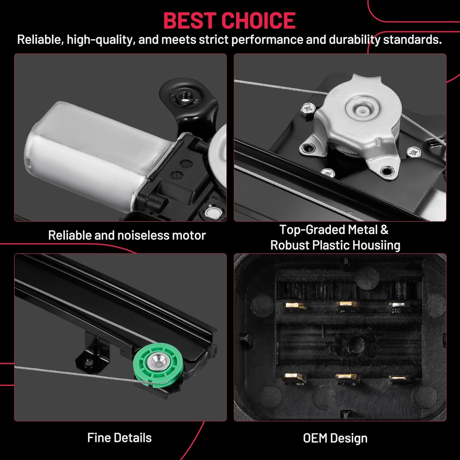 【Premium Quality】 This window regulator and motor assembly feature significant enhancements over the factory part, providing a higher level of reliability. It incorporates tension springs to effectively resist cable reel binding caused by prolonged use. Additionally, it is equipped with advanced cable guides to eliminate high cable tension and reduce cable stress.