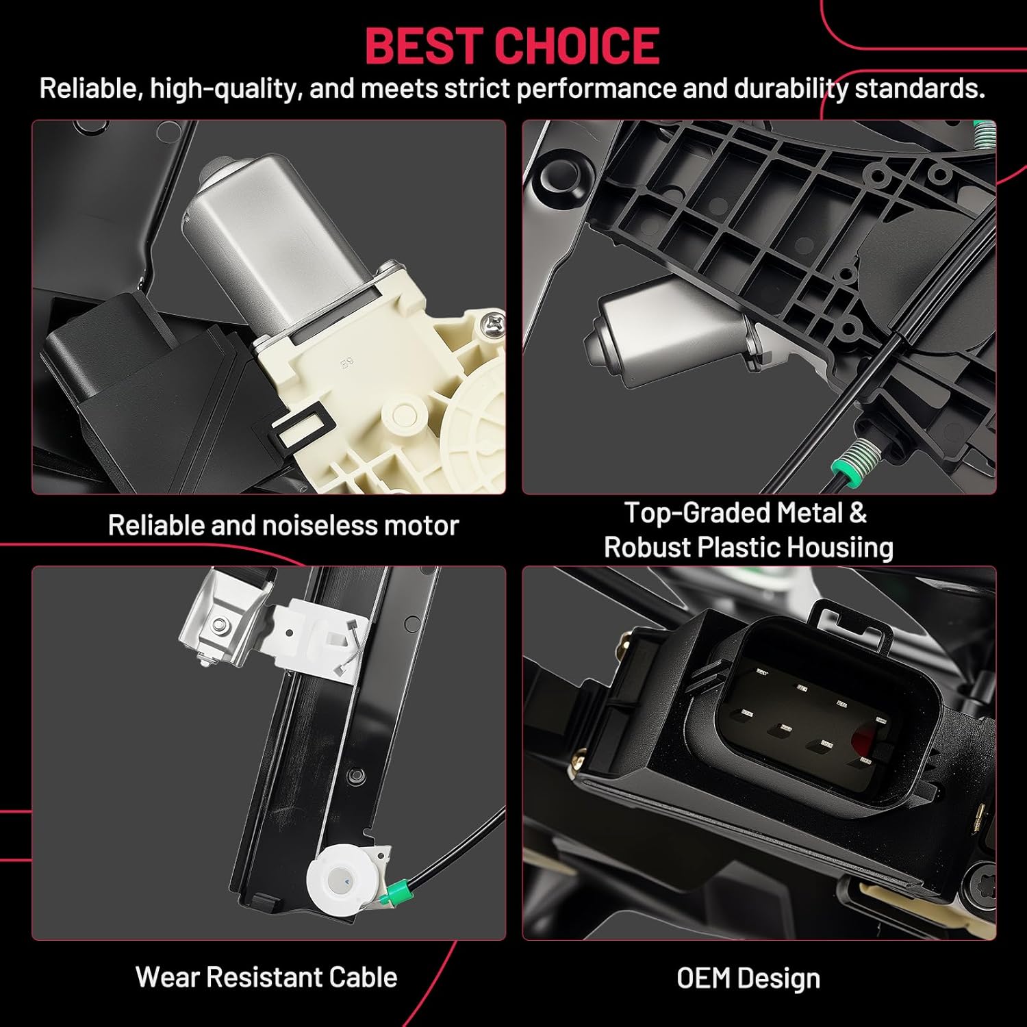 【Premium Quality】 This window regulator and motor assembly feature significant enhancements over the factory part, providing a higher level of reliability. It incorporates tension springs to effectively resist cable reel binding caused by prolonged use. Additionally, it is equipped with advanced cable guides to eliminate high cable tension and reduce cable stress.