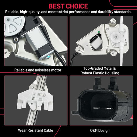 【Premium Quality】 This window regulator and motor assembly feature significant enhancements over the factory part, providing a higher level of reliability. It incorporates tension springs to effectively resist cable reel binding caused by prolonged use. Additionally, it is equipped with advanced cable guides to eliminate high cable tension and reduce cable stress.