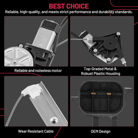 【Premium Quality】 This window regulator and motor assembly feature significant enhancements over the factory part, providing a higher level of reliability. It incorporates tension springs to effectively resist cable reel binding caused by prolonged use. Additionally, it is equipped with advanced cable guides to eliminate high cable tension and reduce cable stress.