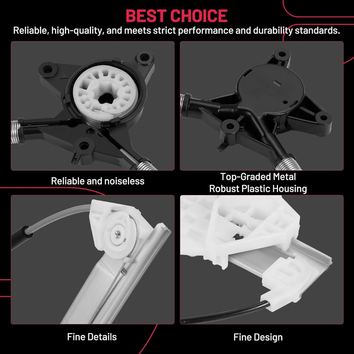 【Premium Quality】 This window regulator and motor assembly feature significant enhancements over the factory part, providing a higher level of reliability. It incorporates tension springs to effectively resist cable reel binding caused by prolonged use. Additionally, it is equipped with advanced cable guides to eliminate high cable tension and reduce cable stress.