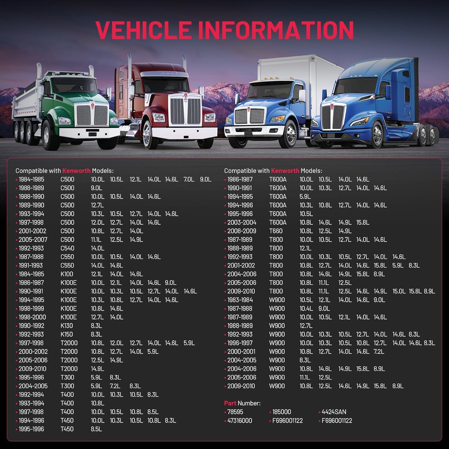 Part Number - Replace# 78595 185000 4424SAN 47316000 F696001122 F696001122. NOTE: Please use "amazon confrmed fit" tool to enter your year, make, and model to avoid mismatch with the model can not be used