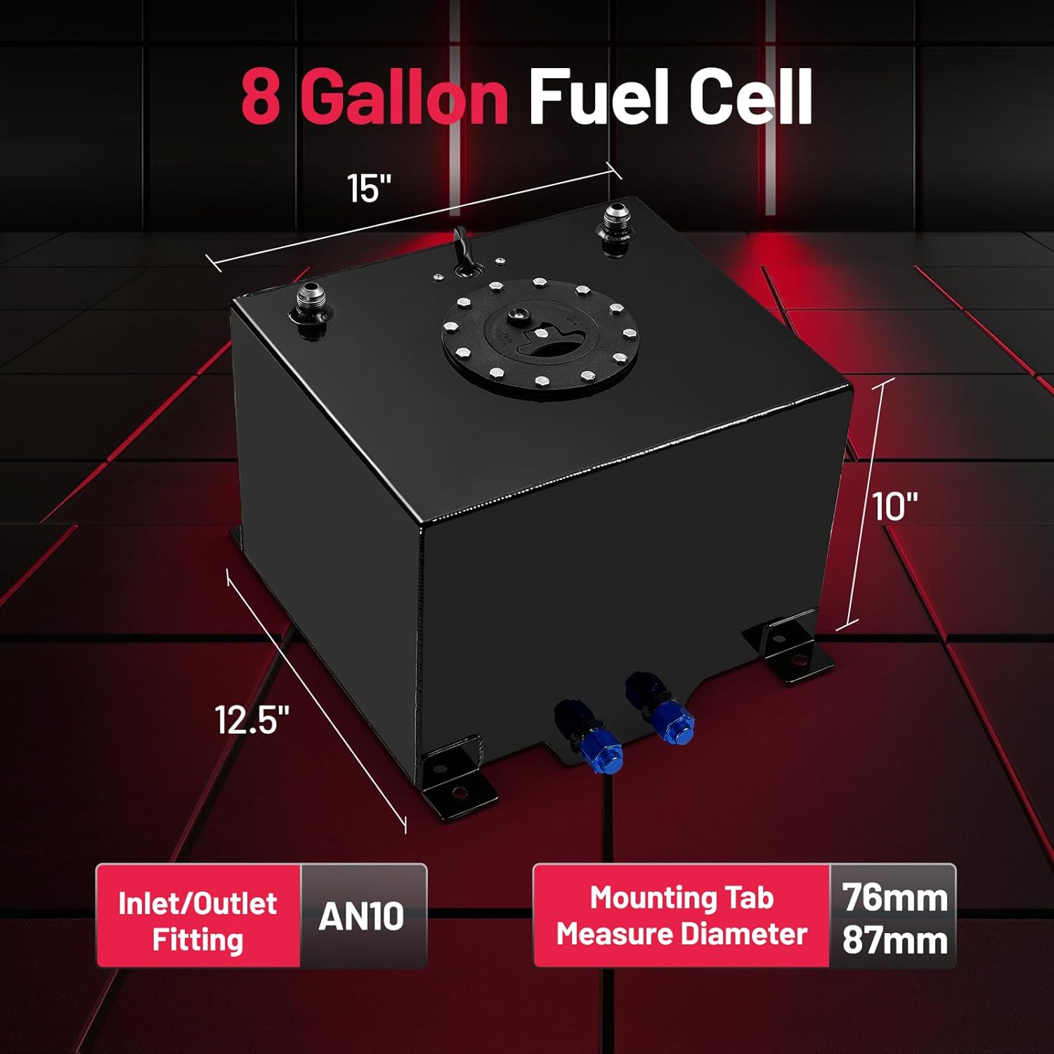 Material: Our fuel cell is made of 1060H24 aluminum and the fuel cap is made of plastic. Drift Fuel Cell Size: 15" (L) x 12.5" (W) x 10" (H), Mounting Tab Measure Diameter :76.01mm/87.36mm, Inlet/Outlet fitting: AN10.