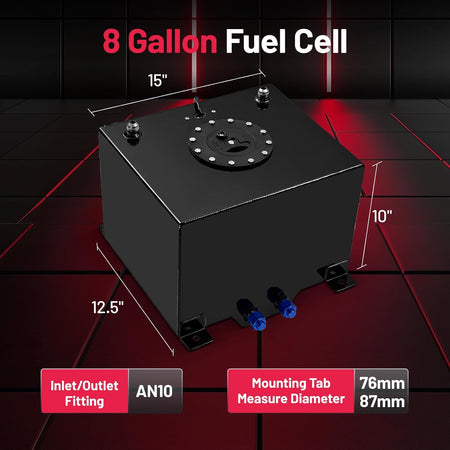 Package includes: 1 x Aluminum 8 Gallon Fuel Cell with built-in level sensor (3-90 ohm) and splash-proof foam. This fuel tank is universal compatible with hot rods/street racing/track cars/trucks/SUVs etc.