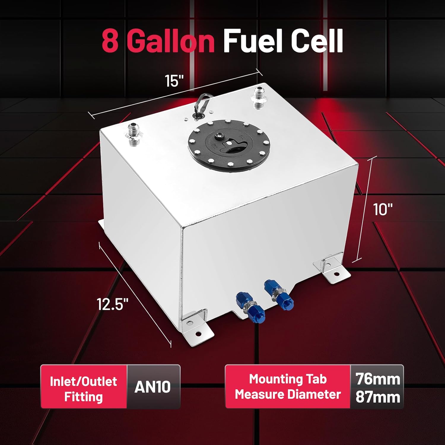 Material: Our fuel cell is made of 1060H24 aluminum and the fuel cap is made of plastic. Drift Fuel Cell Size: 15" (L) x 12.5" (W) x 10" (H), Mounting Tab Measure Diameter :76.01mm/87.36mm, Inlet/Outlet fitting: AN10.