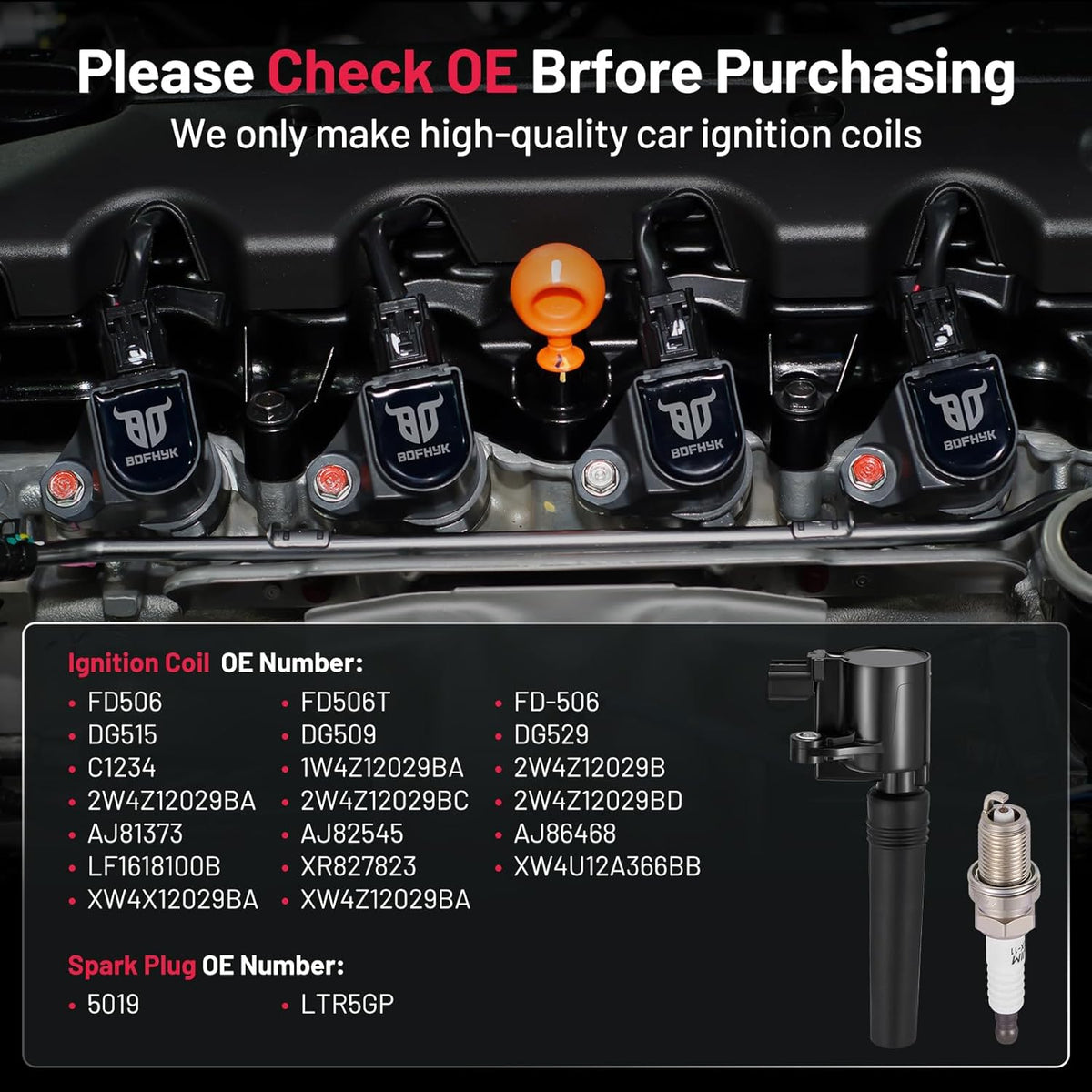 【Yes, you need a new coil and spark plug!】If your car has been used for a long time(over 80000km) and has problems like car shaking, start-up failure, speeding up slowly, and increasing fuel consumption, you may need to change a new set of spark plugs and coil packs. BDFHYK ignition coil packs and spark plugs can offer you a professional user experience and make your car like new. You may choose it with confidence.