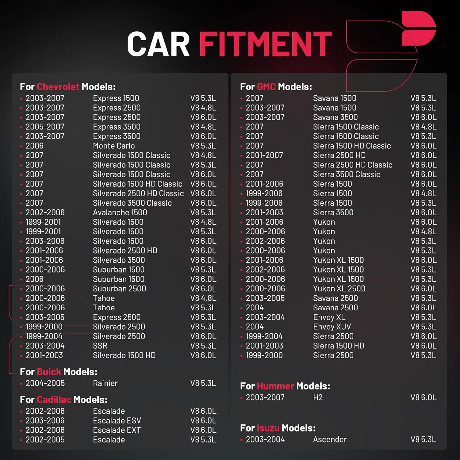 【Basic Info:】Ignition Coil UF262 & Spark Plugs 3186 Compatible with GMC 1999-2006 Sierra Savana Yukon Envoy; Compatible with Chevy 2003-2007 Silverado Suburban Express Avalanche 1500 2500 3500; Compatible with Buick 2004-2005 Rainier; Compatible with Hummer 2003-2007 H2; Compatible with Isuzu 2003-2004 Ascender.Please check detail fitting info from pics or detail page.Please choose suitable coil pack and plugs with confidence.