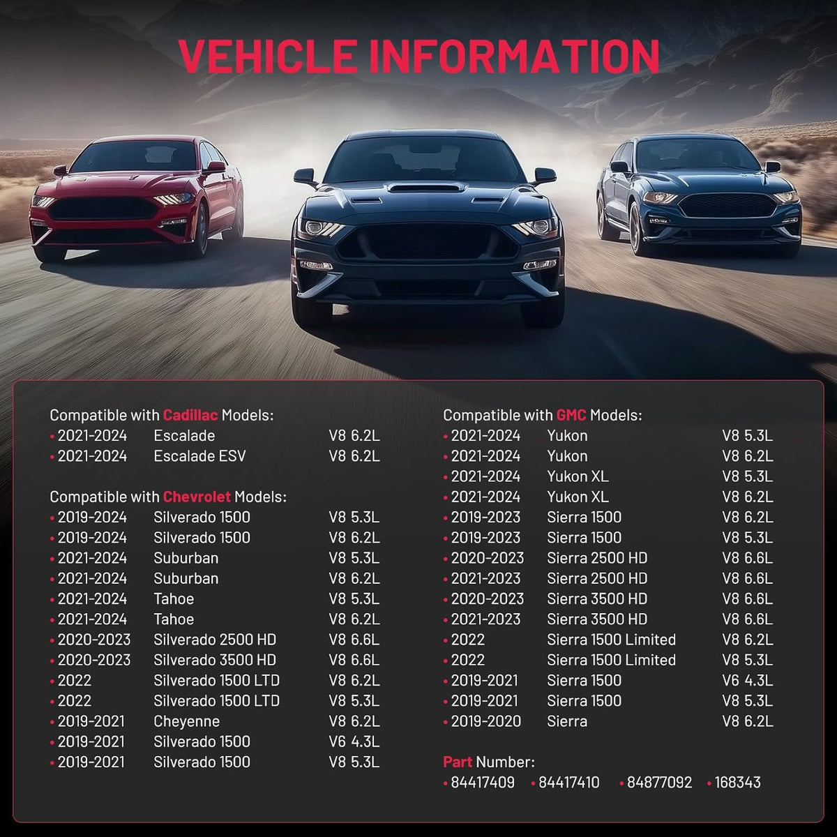 Part Number - Replace# 84417409 84417410 84877092 168343. Compatible with GMC: Yukon V8 5.3L 6.2L 2021-2024, Yukon XL V8 5.3L 6.2L 2021-2024, Sierra 1500 V8 5.3L 6.2L 2019-2023, Sierra 2500 HD V8 6.6L 2020-2023, Sierra 3500 HD V8 6.6L 2021-2023, Sierra 1500 Limited V8 5.3L 6.2L 2022, Sierra 1500 V6 4.3L 5.3L 2019-2021, Sierra V8 6.2L 2019-2020. NOTE: Please use "amazon confrmed fit" tool to enter your year, make, and model to avoid mismatch with the model can not be used.