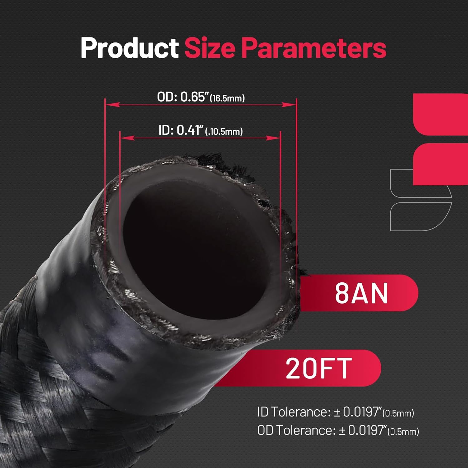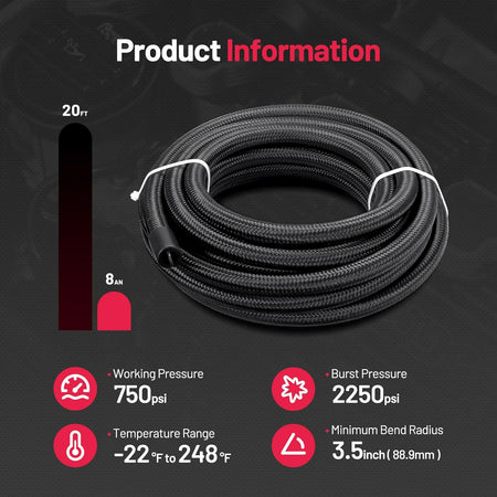 Specifications: ID: 7/16"(0.43 inches);OD: 0.642 inches;Working Pressure: 500 PSI;Burst Pressure: 2000 PSI;Minimum Bending Radius: 88.9mm;Temperature Range: -40°F to 257°F(-40°C to 125°C);Hose Length: 20FT (6M);Thread Specification: 3/4-16 UNF (8AN)