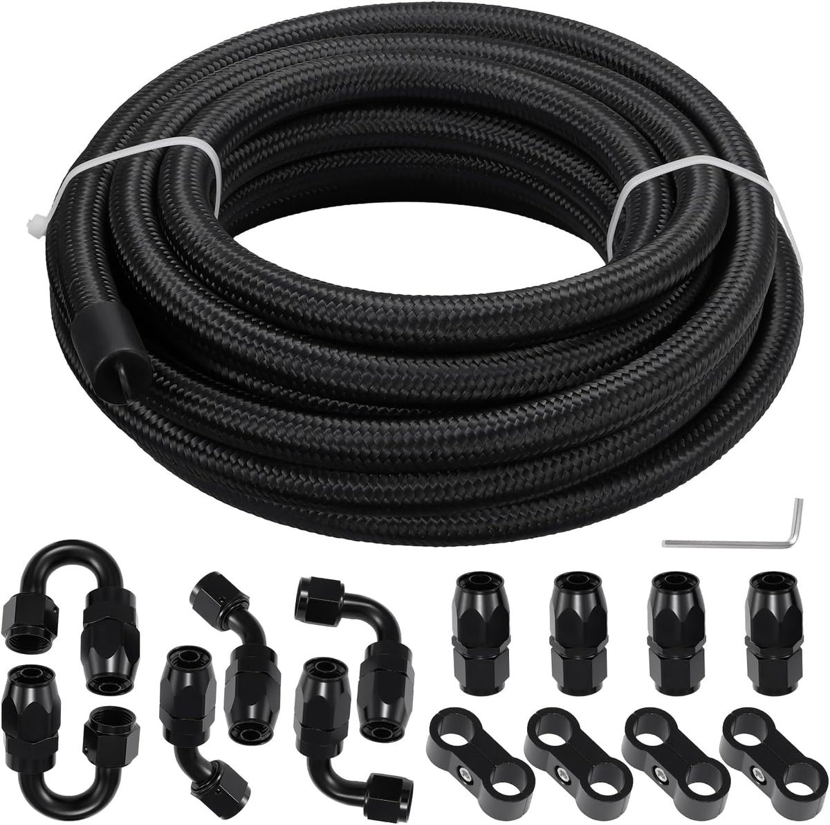 Package Includes: 1x 20FT CPE Braided Fuel Line;4x AN8 Straight Swivel Hose Ends;2x AN8 45-Degree Swivel Hose Ends;2x AN8 90-Degree Swivel Hose Ends;2x AN8 180-Degree Swivel Hose Ends;4x AN8 Fuel Hose Separator Clamps;1x Hose Clamp Installation Tool