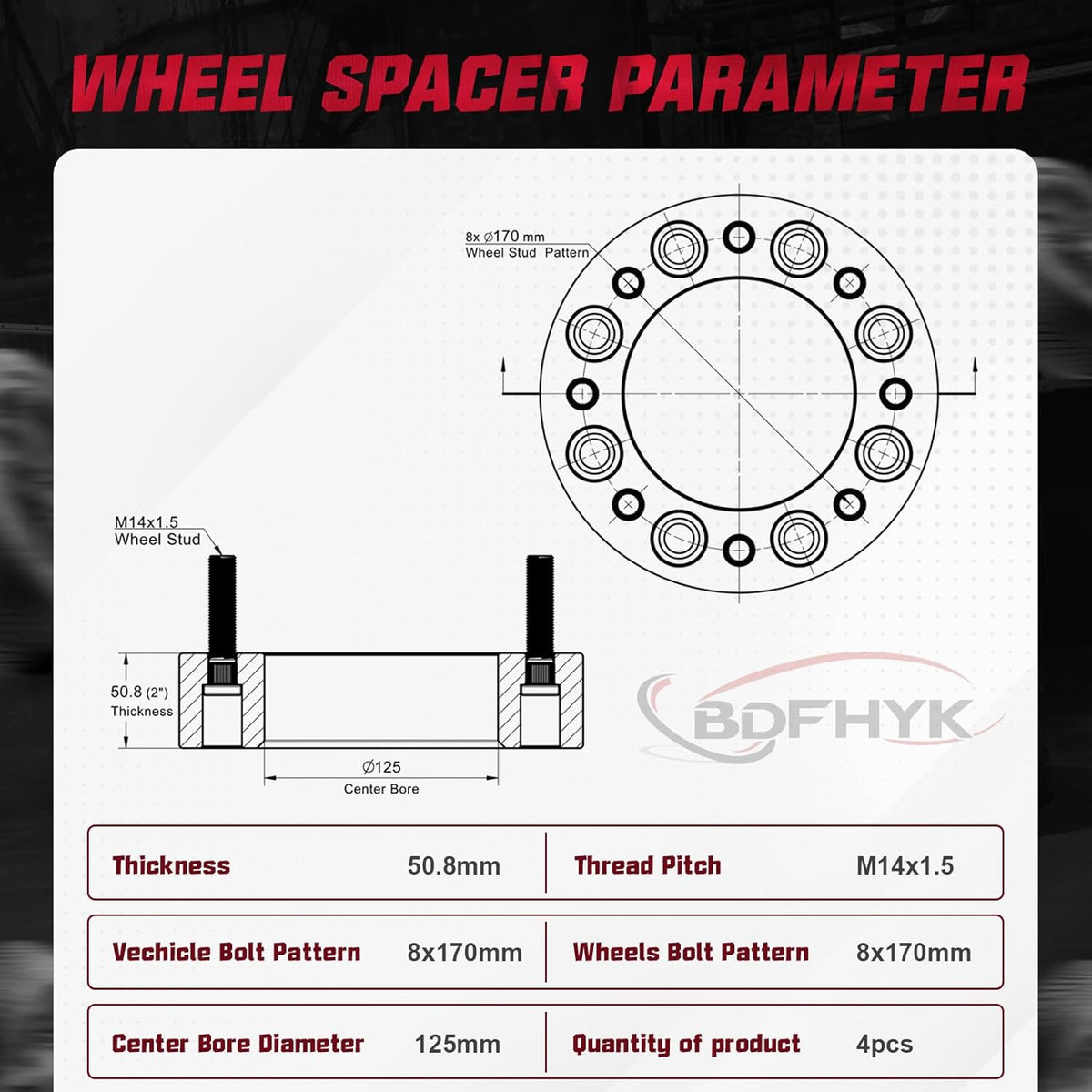 Product Specs: Set of 4, 2 inch/50.8 mm Thickness, 8x170mm Wheel Bolt Pattern, 125mm Center Bore, M14x1.5 Thread Pitch (without lip hub). Protective gloves, Cleaning wire balls