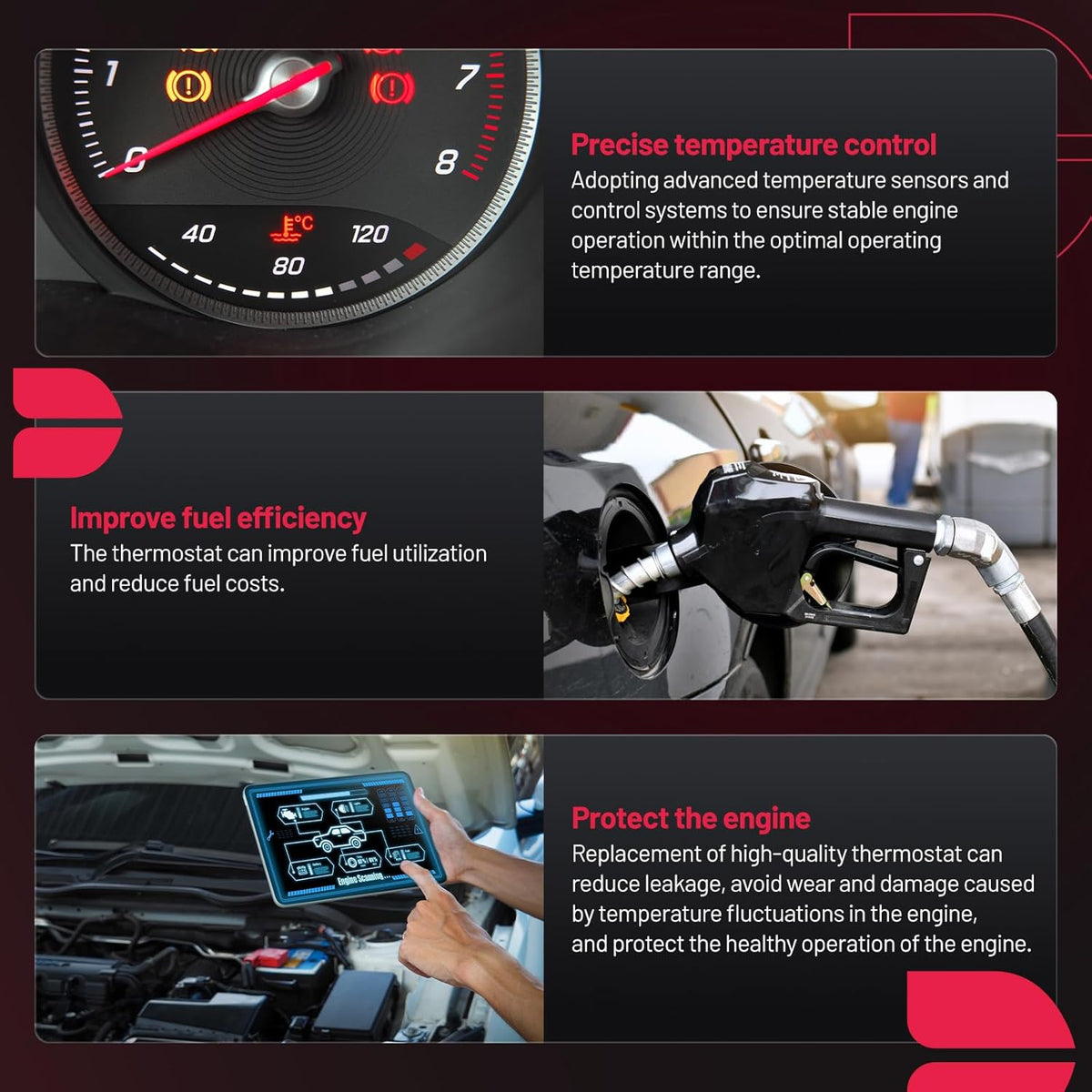 【Function】:Thermostat Housing Assembly is to regulate the temperature of the engine by controlling the flow of coolant through the radiator. The thermostat opens and closes based on the temperature of the engine, allowing coolant to flow through the radiator when the engine is too hot and restricting flow when the engine is too cold. This helps to maintain the engine at an optimal operating temperature, which improves fuel efficiency and prolongs the life of the engine.