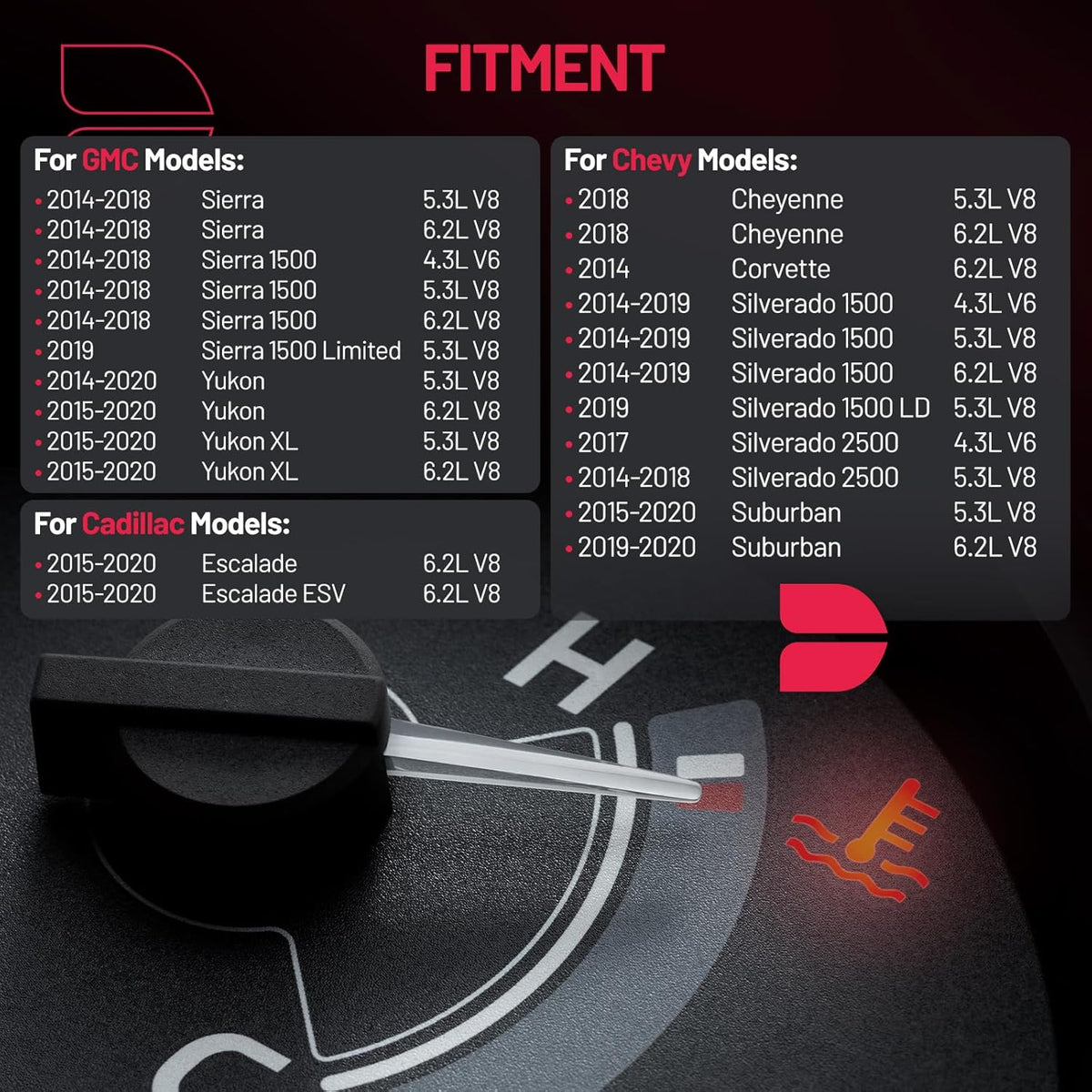 【Fitment information】:Thermostat Housing Assembly Compatible with Cadillac 2015-2020 Escalade/Escalade ESV; Compatible with Chevy 2018 Cheyenne, 2014-2019 Silverado 1500, 2019 Silverado 1500 LD, 2014-2018 Silverado 2500, 2015-2020 Suburban, 2014-2020 Tahoe; Compatible with GMC 2014-2018 Sierra/Sierra 1500, 2019 Sierra 1500 Limited, 2014-2020 Yukon, 2015-2020 Yukon XL. Engine fitment:4.3L V6, 5.3L 6.2L V8.