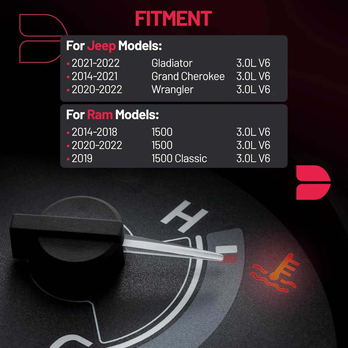 【Fitment information】:Thermostat Housing Assembly Compatible with Jeep 2021-2022 Gladiator, 2014-2021 Grand Cherokee, 2020-2022 Wrangler; Compatible with Ram 2020-2022 1500, 2014-2018 1500, 2019 1500 Classic. Engine fitment:3.0L V6.