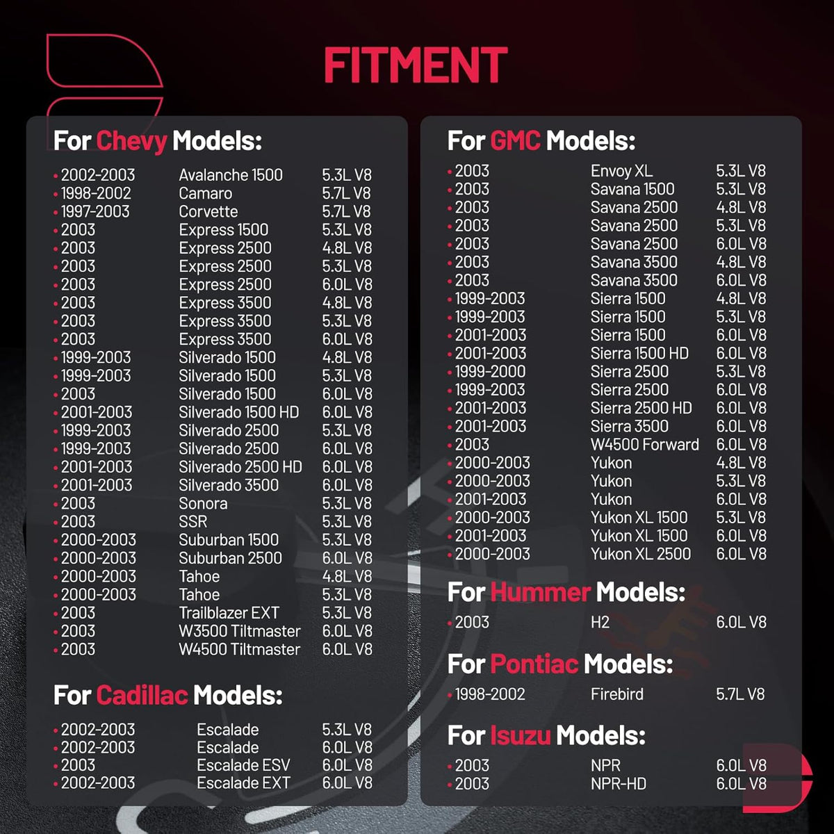 【Fitment information】:Thermostat Housing Assembly Compatible with Cadillac 2002-2003 Escalade Escalade EXT, 2003 Escalade ESV; Compatible with Chevy 2002-2003 Avalanche 1500, 1998-2002 Camaro, 1997-2003 Corvette, 1999-2003 Silverado 1500 2500, 2001-2003 Silverado 1500 HD 2500 HD 3500, 2000-2003 Suburban 1500 2500 Tahoe; Compatible with GMC 1999-2003 Sierra 1500 2500, 2001-2003 Sierra 1500 HD 2500 HD 3500, 2001-2003 Yukon. Engine fitment:4.8L 5.3L 5.7L 6.0L V8.