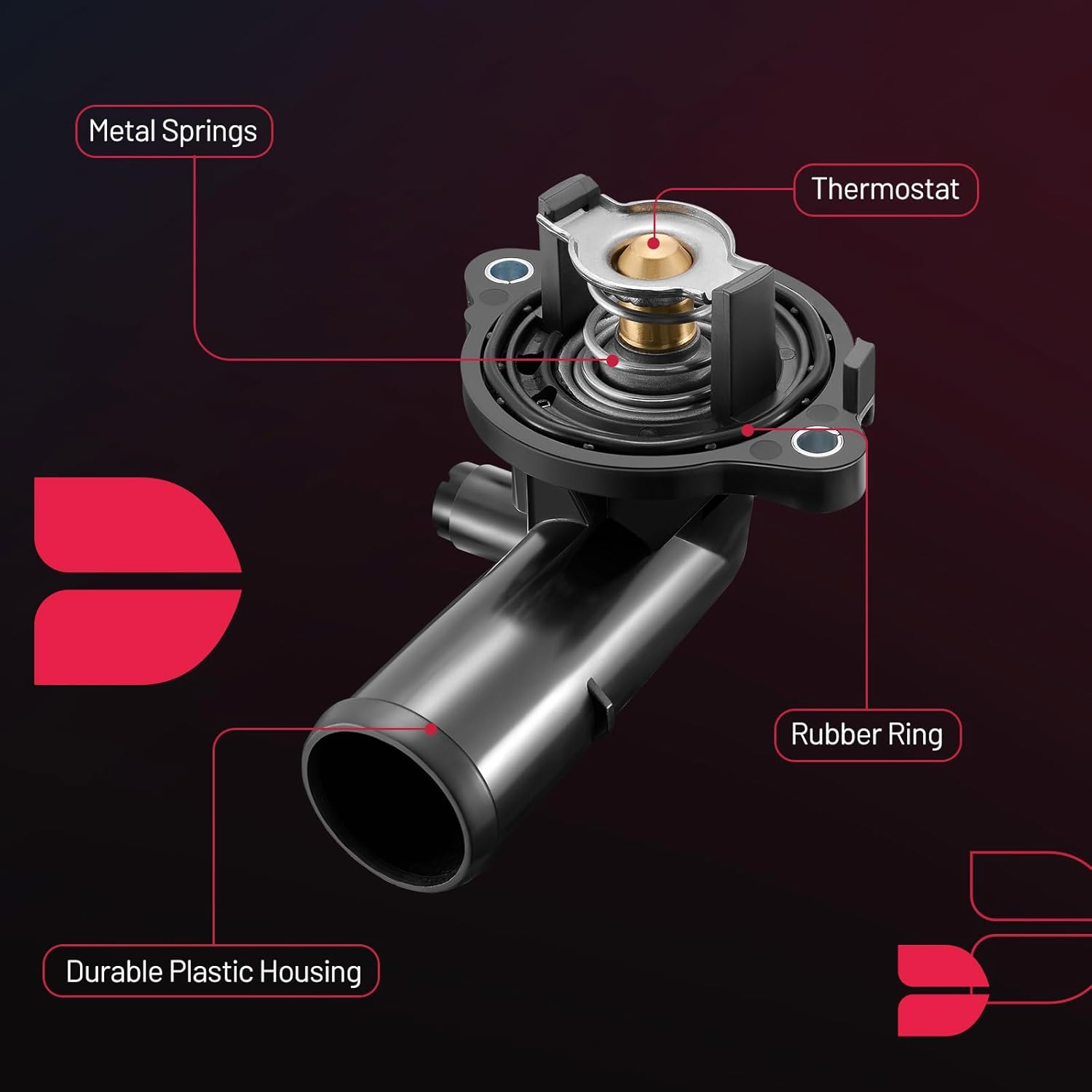 【Function】:Thermostat Housing Assembly is to regulate the temperature of the engine by controlling the flow of coolant through the radiator. The thermostat opens and closes based on the temperature of the engine, allowing coolant to flow through the radiator when the engine is too hot and restricting flow when the engine is too cold. This helps to maintain the engine at an optimal operating temperature, which improves fuel efficiency and prolongs the life of the engine.