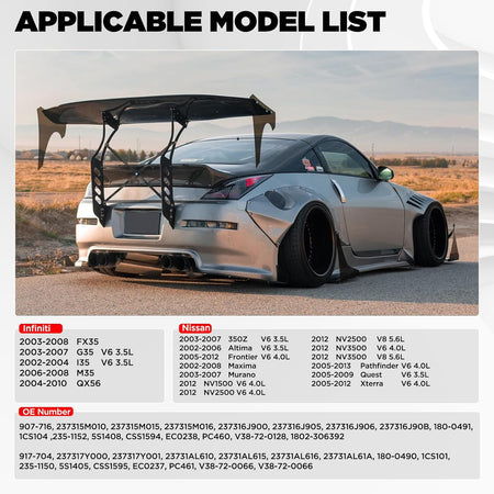 Compatible Models: for INFINITI FX35 03-08, G35 03-07, I35 02-04, M35 06-10, 350Z 03-07, ALTIMA 02-06, FRONTIER 05-12, MAXIMA 02-08, MURANO 03-07, NV1500 12-13, NV2500 12-13, NV3500 12, PATHFINDER 05-12, QUEST 04-09, XTERRA 05-12