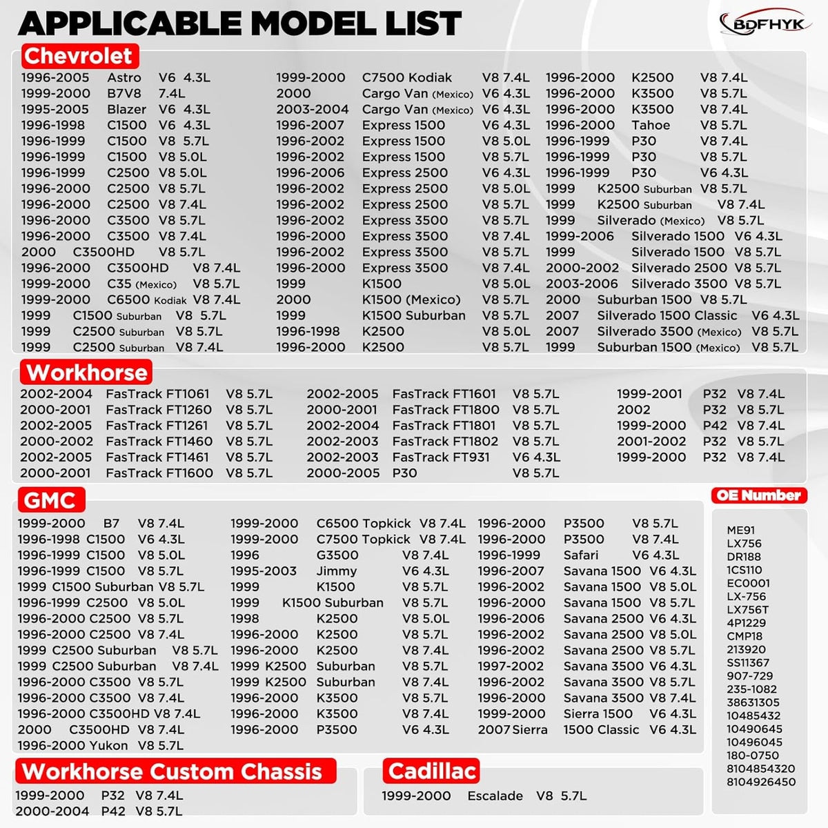 SAVANA 1500 96-07 2500 96-06 3500 96-02, TOPKICK 99-00, YUKON 96-00 / WORKHORSE FT1061 02-04, FT1260 00-01, FT1261 02-05, FT1460 00-02, FT1461 02-05, FT1600 00-01, FT1601 02-05, FT1800 00-01, FT1801 02-04, FT1802 02-03, FT931 02-03, P30 00-05