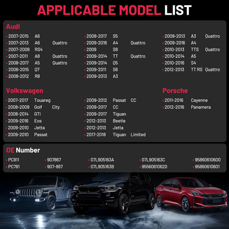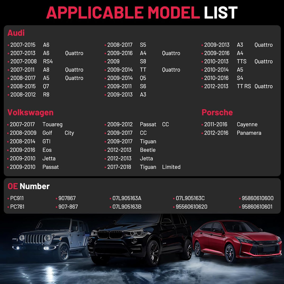 【Compatible Vehicles】For Audi Models: 2007-2015 A6 2008-2017 S5 2009-2013 A3 Quattro 2007-2013 A6 Quattro 2009-2016 A4 Quattro 2009-2016 A4 2007-2008 RS4 2009 S8 2010-2013 TTS Quattro 2007-2011 A8 Quattro 2009-2014 TT Quattro 2010-2014 A5 2008-2017 A5 Quattro 2009-2014 S4 2008-2015 S6 2009-2011 TT RS Quattro 2008-2012 R8 2009-2013 A3