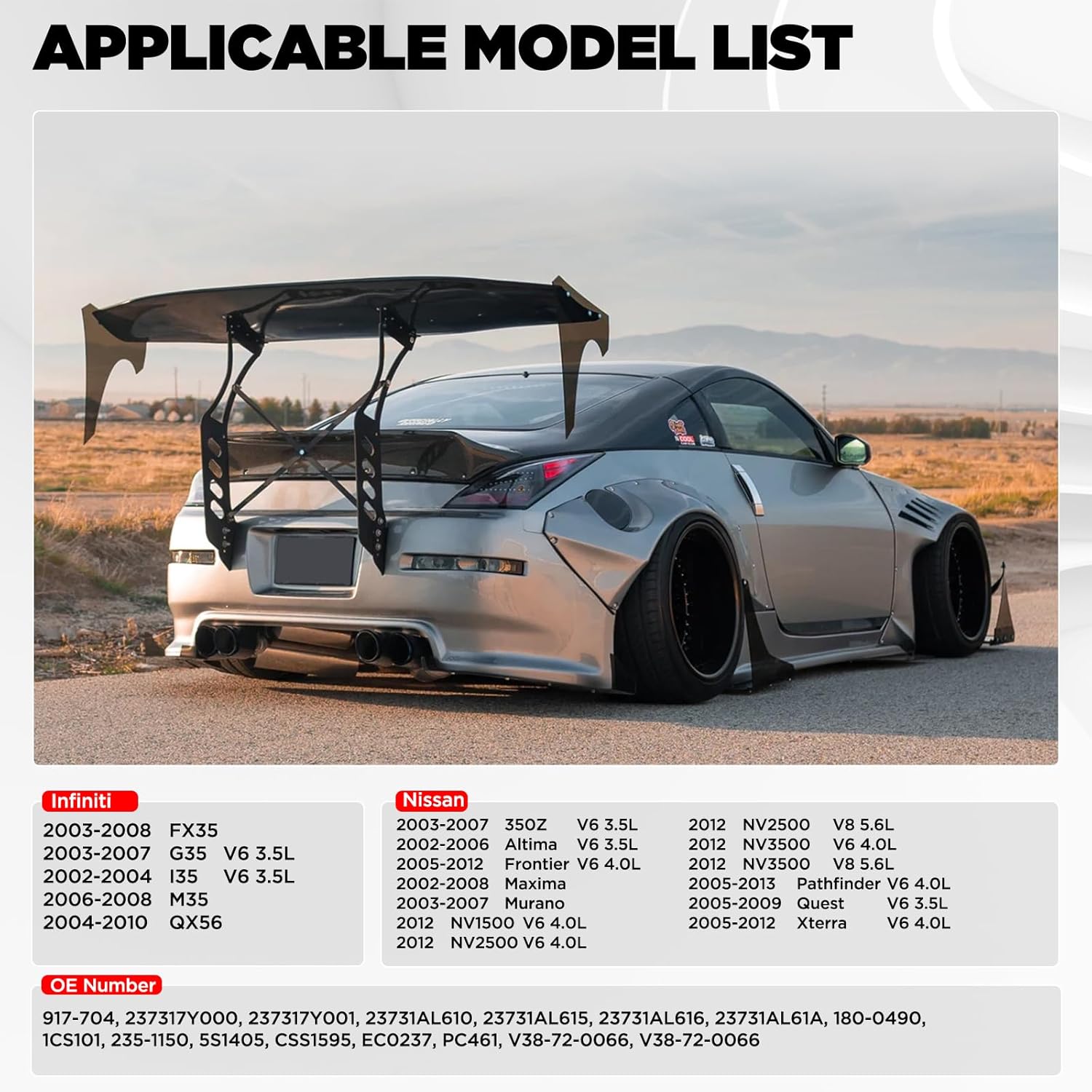 Compatible with: INFINITI FX35 2003-2008, Compatible with G35 2003-2007, Compatible with I35 2002-2004, Compatible with M35 2006-2008, Compatible with QX56 2004-2010, Compatible with NISSAN 350Z 2003-2007, Compatible with ALTIMA 2002-2006, Compatible with FRONTIER 2005-2012, Compatible with MAXIMA 2002-2008, Compatible with MURANO 2003-2007, Compatible with NV1500 2012, Compatible with NV2500 2012, Compatible with NV3500 2012