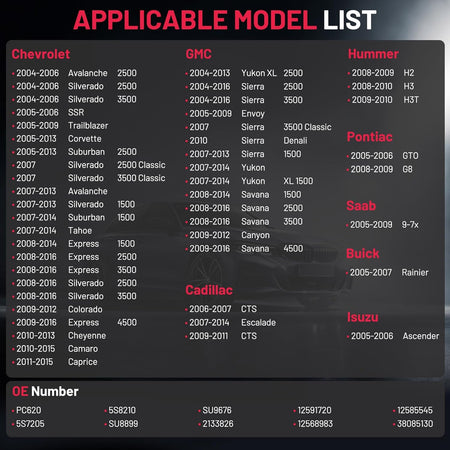 【Compatible Vehicles】For Chevrolet Models: 2004-2006 Avalanche 2500 2004-2006 Silverado 2500 2004-2006 Silverado 3500 2005-2006 SSR 2005-2009 Trailblazer 2005-2013 Corvette 2005-2013 Suburban 2500 2007 Silverado 2500 Classic 2007 Silverado 3500 Classic 2007-2013 Avalanche 2007-2013 Silverado 1500 2007-2014 Suburban 1500 2007-2014 Tahoe 2008-2014 Express 1500 2008-2016 Express 2500 2008-2016 Express 3500 2008-2016 Silverado 2500 2008-2016 Silverado 3500 2009-2012 Colorado 2009-2016 Express 4500 2010-2013 Cheyenne 2010-2015 Camaro 2011-2015 Caprice
