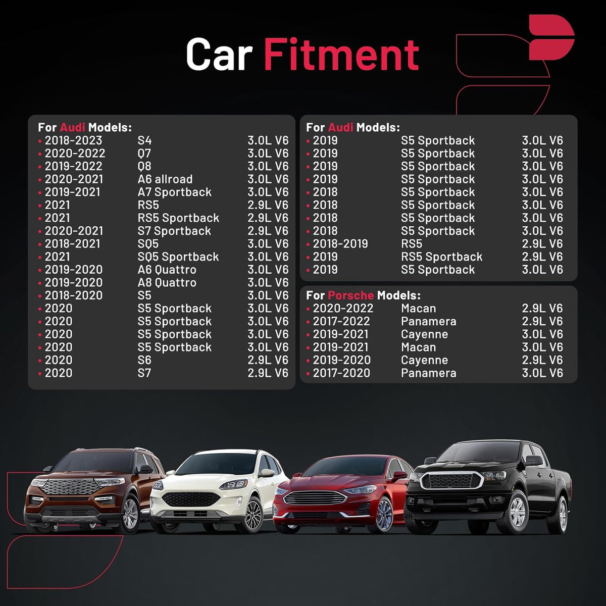【Compatibility Information】:Spark Plug 93560 Compatible with Audi 2020-2021 A6 allroad, 2019-2020 A6 Quattro, 2019-2021 A7 Sportback, 2019-2020 A8 Quattro, 2020-2022 Q7, 2019-2022 Q8, 2018-2019 RS5, 2019 2021 RS5 Sportback, 2018-2023 S4, 2018-2020 S5 S5 Sportback, 2020 S6, 2020 S7, 2020-2021 S7 Sportback, 2018-2021 SQ5, 2021 SQ5 Sportback; Compatible with Porsche 2019-2021 Cayenne, 2019-2022 Macan, 2017-2022 Panamera.Please see images or details page for complete Compatibility information.