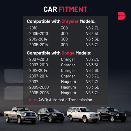 [Vehicle Fitment] The Front Drive Shaft compatible with Chrysler models: 2010 300 V6 2.7L, 2005-2010 300 V6 3.5L, 2012-2014 300 V6 3.6L, 2005-2014 300 V8 5.7L; compatible with Dodge Models: 2007-2010 Charger V6 2.7L/3.5L, 2012-2014 Charger V6 3.6L, 2007-2014 Charger V8 5.7L, 2007 Magnum V6 2.7L, 2005-2008 Magnum V6 3.5L/ V8 5.7L, AWD, Automatic Transmission