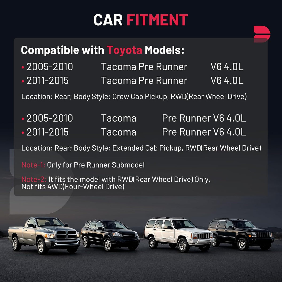 [Vehicle Fitment] The Rear Drive Shaft compatible with Toyota models: 2005-2010 Tacoma V6 4.0L, Auto Trans, Bed Length: 60.3 in, 2011-2015 Tacoma V6 4.0L, Bed Length: 60.3 in, Body Style: Crew Cab Pickup; 2005-2010 Tacoma V6 4.0L, Automatic Trans, 2011-2015 Tacoma V6 4.0L, Body Style: Extended Cab Pickup. Note: Only for Pre Runner Submodel