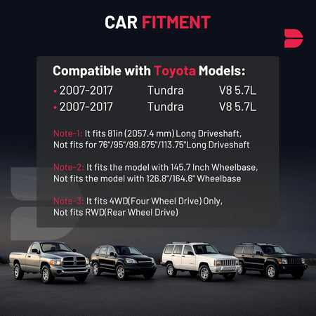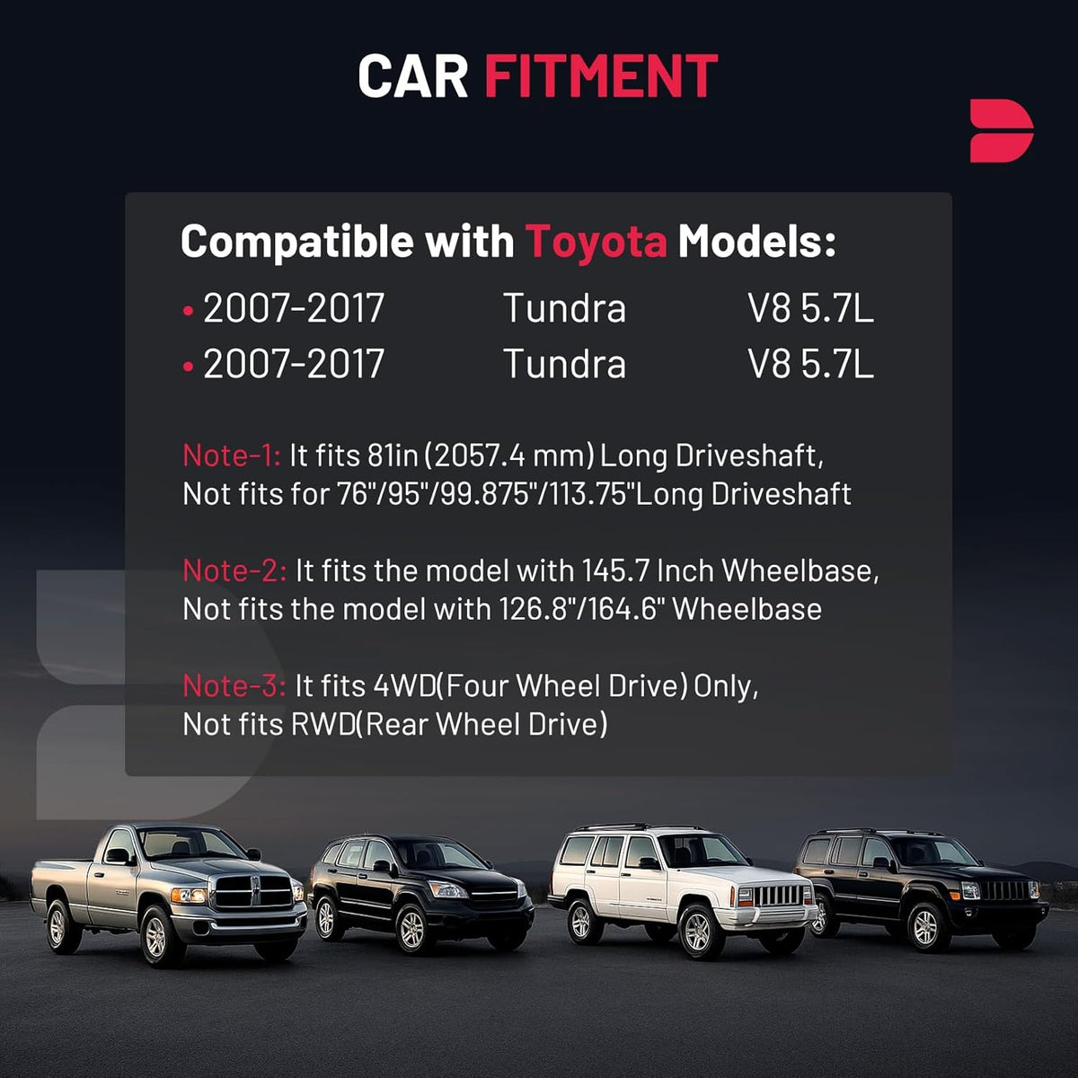 [Vehicle Fitment] The Rear Drive Shaft compatible with Toyota models: 2007-2017 Tundra V8 5.7L Crew Cab Pickup, 2007-2017 Tundra V8 5.7L Standard Cab Pickup. Note2: It fits the model with 145.7 Inch Wheelbase, Not fits the model with 126.8"/164.6" Wheelbase