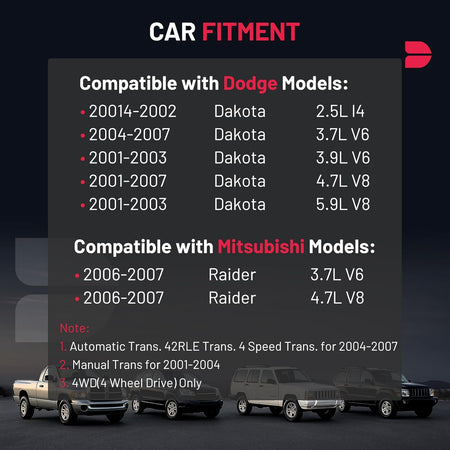 [Vehicle Fitment] The Front Drive Shaft compatible with Dodge models: 2014-2002 Dakota 2.5L l4, 2004-2007 Dakota 3.7L V6, 2001-2003 Dakota 3.9L V6/ 5.9L V8, 2001-2007 Dakota 4.7L V8; compatible with Mitsubishi models: 2006-2007 Raider 3.7L V6/ 4.7L V8. Note: 1. Automatic Trans. 42RLE Trans. 4 Speed Trans. for 2004-2007. 2. Manual Trans for 2001-2004