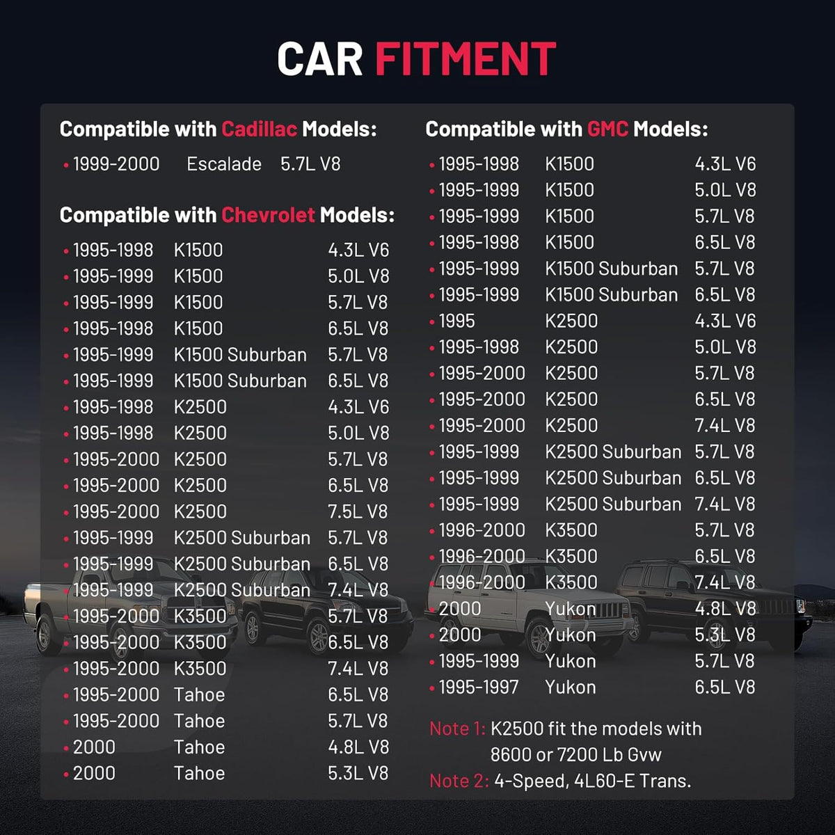 [Vehicle Fitment] The Front Drive Shaft compatible with Chevy models: 1995-1999 K1500/K1500 Suburban/K2500 Suburban, 1995-2000 K2500/K3500/Tahoe; compatible with GMC models: 1995-1999 K1500/K1500 Suburban/K2500 Suburban, 1995-2000 K2500/Yukon, 1996-2000 K3500; compatible with Cadillac models: 1999-2000 Escalade