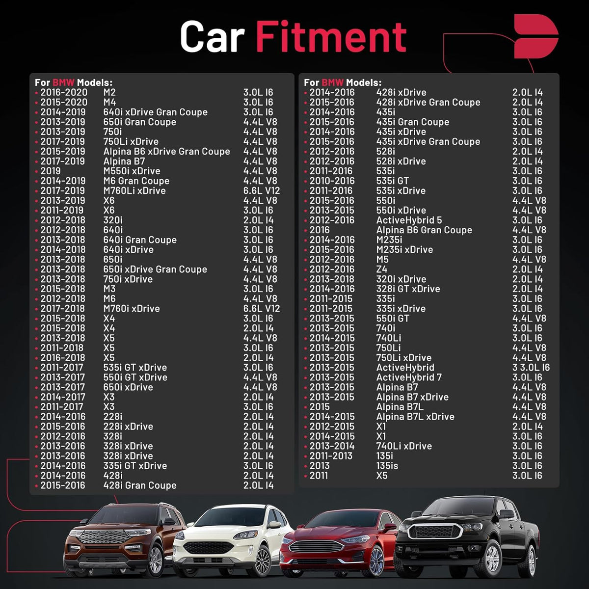【Compatibility Information】:Spark Plug 97506 Compatible with BMW 2011-2013 135i, 2011-2015 335i, 2011-2016 535i, 2011-2017 X3, 2011-2018 X5, 2011, 2019 X6, 2012-2015 X1, 2012-2016 328i 528i M5 Z4, 2012-2018 320i 640i M6, 2013-2015 740i Alpina B7, 2013-2018 650i, 2013-2019 750i, 2014-2016 228i 428i 435i, 2015-2016 550i, 2015-2018 M3 X4, 2015-2020 M4, 2016-2020 M2, 2017-2019 Alpina B7.Please see images or details page for complete Compatibility information.