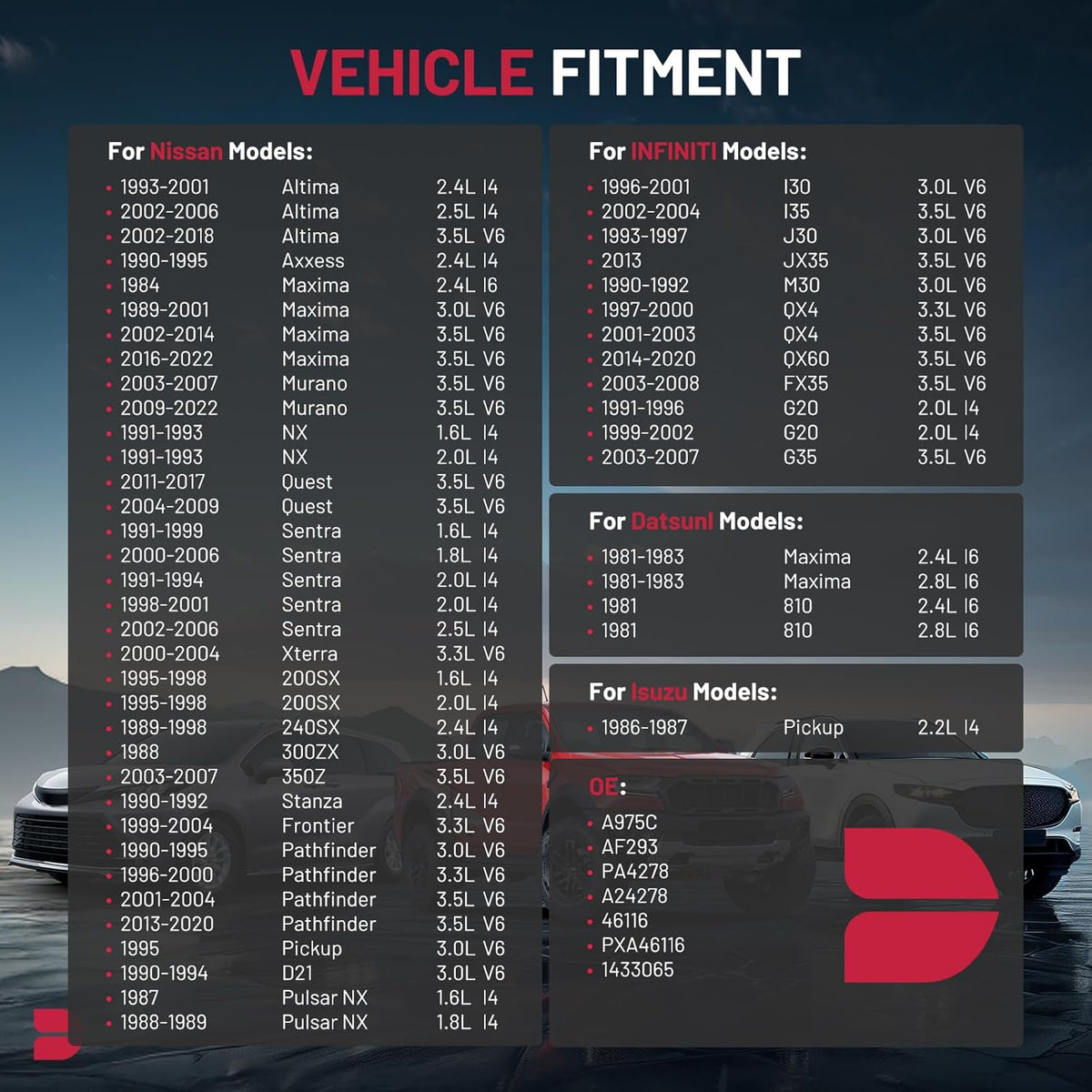【COMPATIBILITY】Compatible with Nissan 200SX 1995-1998, 240SX 1989-1998, 300ZX 1988, 350Z 2003-2007, Altima 1993-2018, Axxess 1990-1995, D21 1990-1994, Frontier 1999-2004, Maxima 1984 1989-2022, Murano 2003-2007 2009-2022, NX 1991-1993, Pathfinder 1990-2004 2013-2020, Pickup 1995, Pulsar NX 1987-1989, Quest 2004-2009 2011-2017, Sentra 1995-2006, Xterra 2000-2004.