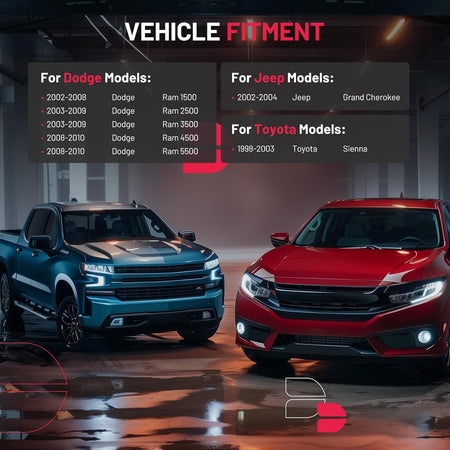 【Fitment information】:Compatible with Toyota 1998-2003 Sienna; Compatible with Jeep 2002-2004 Grand Cherokee; Compatible with Dodge 2002-2008 1500, 2003-2009 Ram 2500, 2003-2009 Ram 3500, 2008-2010 Ram 4500, 2008-2010 Ram 5500.Please confirm the compatibility according to the year/make/model of your vehicle and the OE number of the replaceable part.