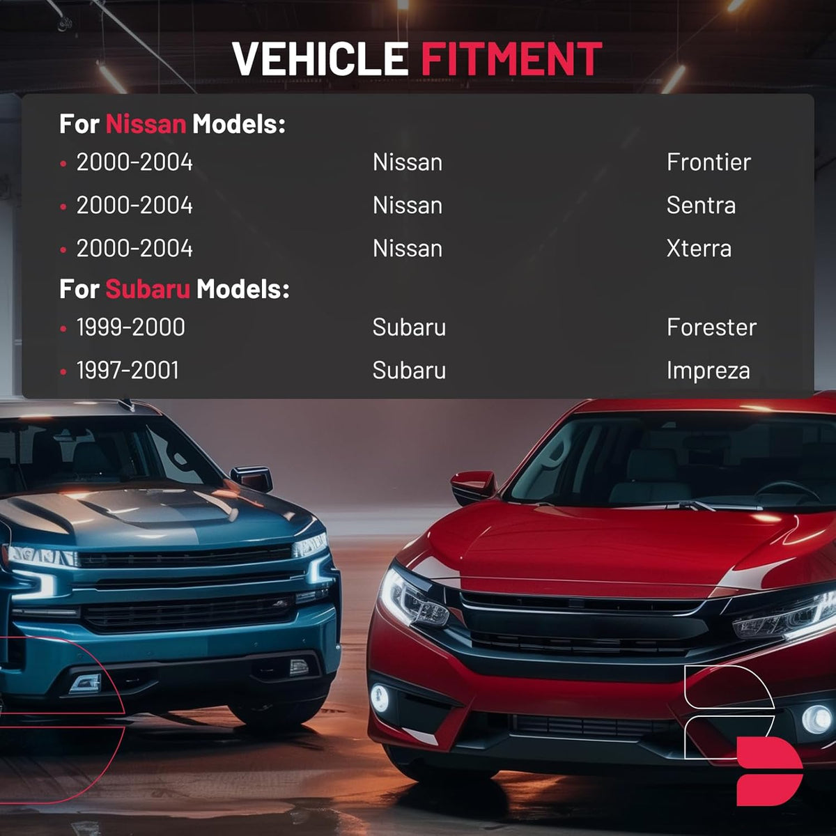 【Fitment information】:Compatible with Nissan 2000-2004 Frontier, 2000-2004 Sentra, 2000-2004 Xterra; Compatible with Subaru 1999-2000 Forester, 1997-2001 Impreza.Please confirm the compatibility according to the year/make/model of your vehicle and the OE number of the replaceable part.