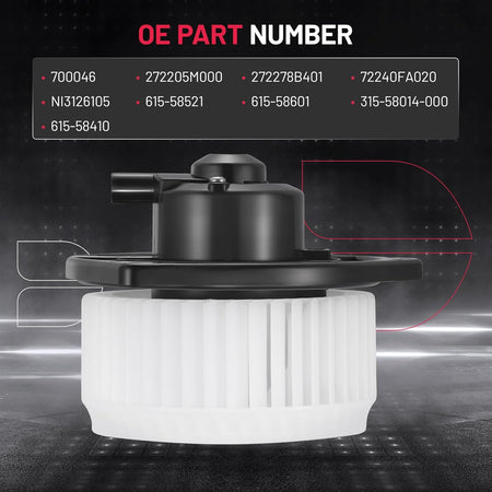 【Compatible Part Numbers】:Replacement for Blower Motor OE Number: 700046 272205M000 272278B401 72240FA020 NI3126105 615-58521 615-58601 315-58014-000 615-58410.