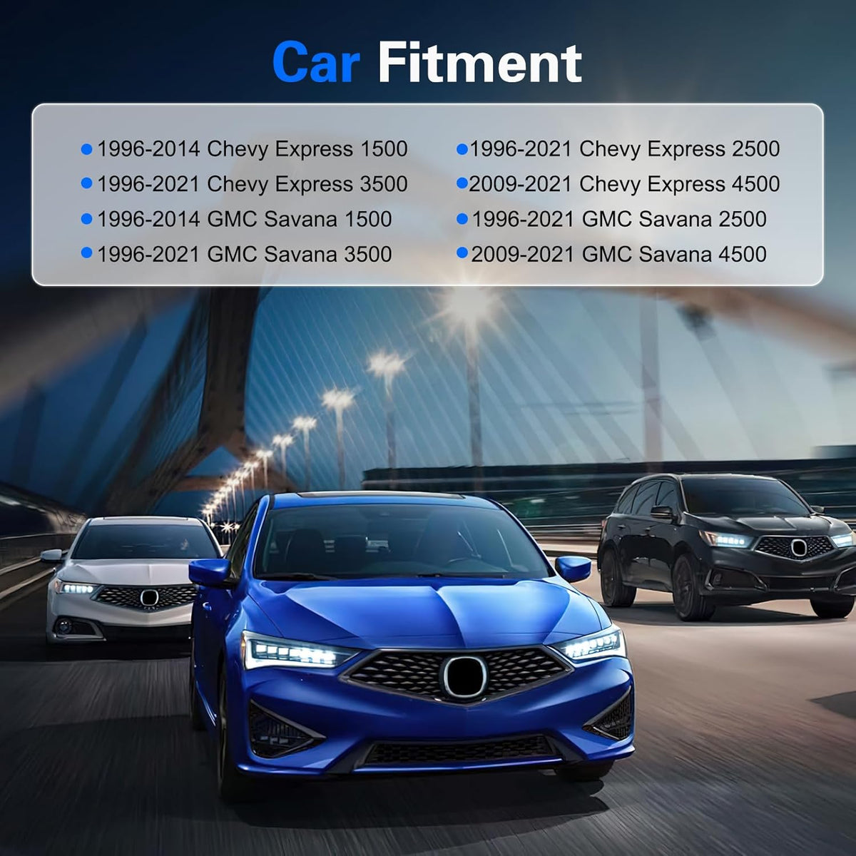 【Fitment information】:Compatible with 1996-2014 Chevy Express 1500, 1996-2021 Chevy Express 2500, 1996-2021 Chevy Express 3500, 2009-2021 Chevy Express 4500, 1996-2014 GMC Savana 1500, 1996-2021 GMC Savana 2500, 1996-2021 GMC Savana 3500, 2009-2021 GMC Savana 4500.Please confirm the compatibility according to the year/make/model of your vehicle and the OE number of the replaceable part.