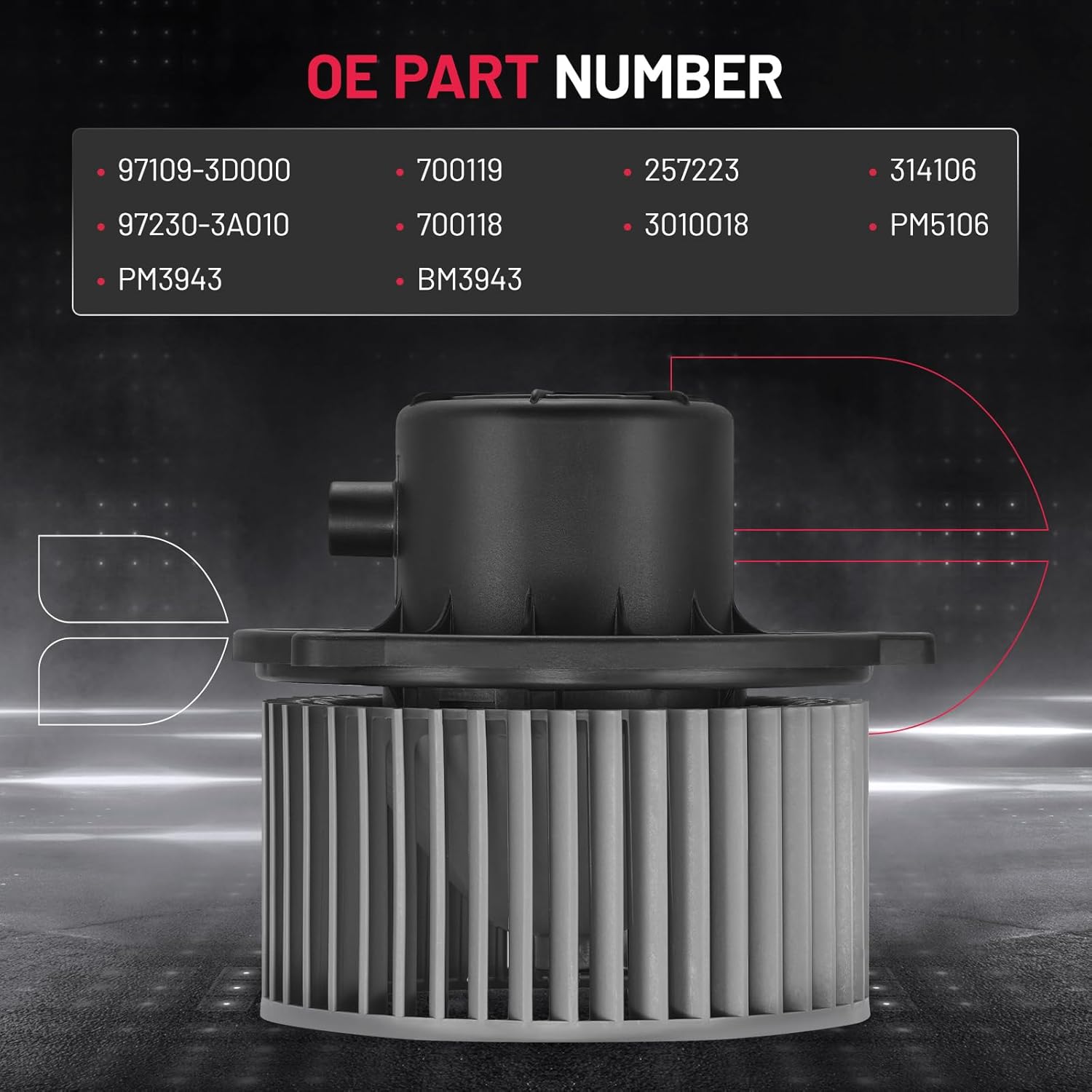 【Compatible Part Numbers】:Replacement for Blower Motor OE Number: 97109-3D000 97230-3A010 700119 700118 257223 3010018 314106 PM5106 PM3943 BM3943.