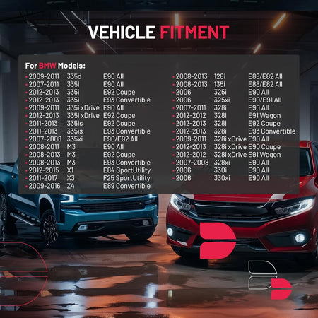 【Fitment information】:Compatible with BMW 2008-2013 128i, 2008-2013 135i, 2006 325i, 2006 325xi, 2007-2013 328i, 2009-2013 328i xDrive, 2007-2008 328xi, 2006 330i, 2006 330xi, 2009-2011 335d, 2007-2013 335i, 2009-2013 335i xDrive, 2011-2013 335is, 2007-2008 335xi, 2008-2013 M3, 2012-2015 X1, 2011-2017 X3, 2009-2016 Z4.Please confirm the compatibility according to the year/make/model of your vehicle and the OE number of the replaceable part.