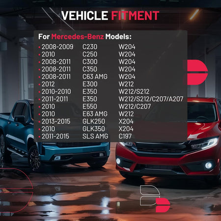 【Fitment information】:Compatible with Mercedes-Benz 2008-2009 C230, 2010 C250, 2008-2011 C300, 2008-2011 C350, 2008-2011 C63 AMG, 2012 E300, 2010-2011 E350, 2010 E63 AMG, 2013-2015 GLK250, 2010 GLK350, 2011-2015 SLS AMG.Please confirm the compatibility according to the year/make/model of your vehicle and the OE number of the replaceable part.