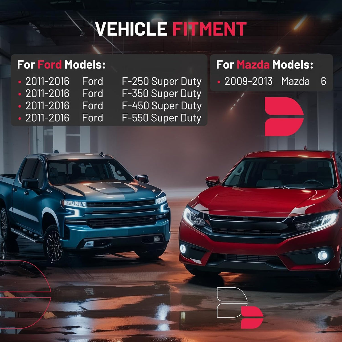 【Fitment information】:Compatible with Mazda 6 2009-2013; Compatible with 2011-2016 F-250 Super Duty, 2011-2016 F-350 Super Duty, 2011-2016 F-450 Super Duty, 2011-2016 F-550 Super Duty.Please confirm the compatibility according to the year/make/model of your vehicle and the OE number of the replaceable part.