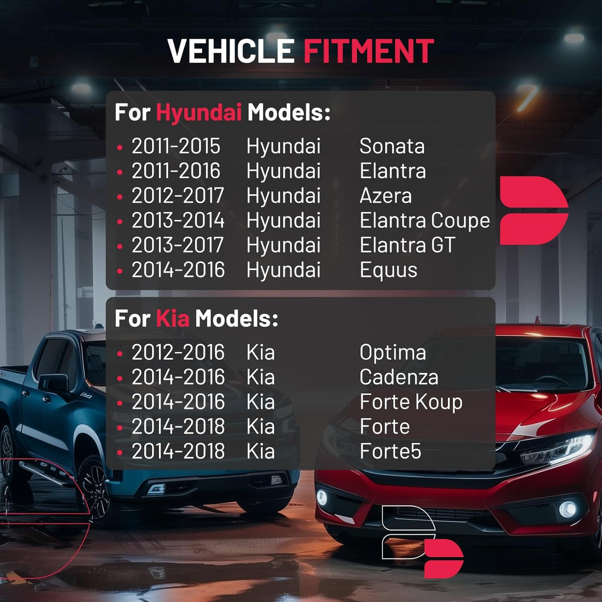 【Fitment information】:Compatible with Hyundai 2012-2017 Azera, 2011-2016 Elantra, 2013-2014 Elantra Coupe, 2013-2017 Elantra GT, 2014-2016 Equus, 2011-2015 Sonata; Compatible with Kia 2014-2016 Cadenza, 2014-2018 Forte, 2014-2016 Forte Koup, 2014-2018 Forte5, 2012-2016 Optima.Please confirm the compatibility according to the year/make/model of your vehicle and the OE number of the replaceable part.
