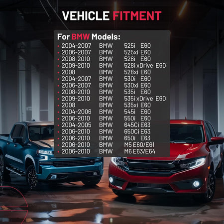 【Fitment information】:Compatible with BMW 2004-2007 525i, 2006-2007 525xi, 2008-2010 528i, 2009-2010 528i xDrive, 2008 528xi, 2004-2007 530i, 2006-2007 530xi, 2008-2010 535i, 2009-2010 535i xDrive, 2008 535xi, 2004-2006 545i, 2006-2010 550i, 2004-2005 645Ci, 2006-2010 650Ci, 2006-2010 650i, 2006-2010 M5, 2006-2010 M6.Please confirm the compatibility according to the year/make/model of your vehicle and the OE number of the replaceable part.