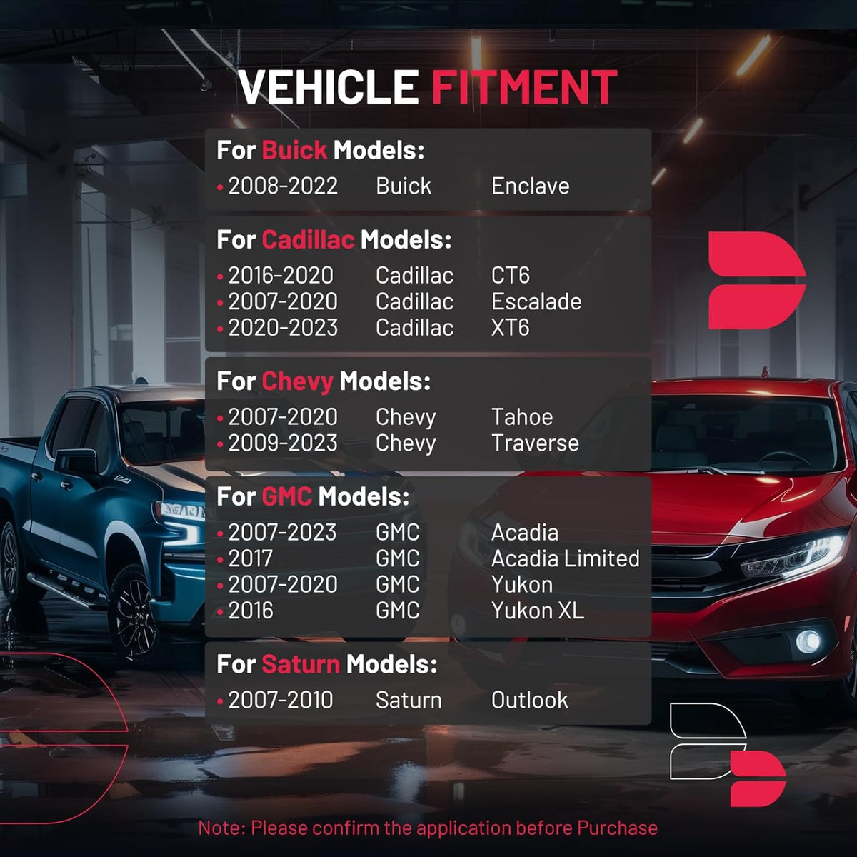 【Fitment information】:Compatible with Buick 2008-2022 Enclave; Compatible with Cadillac 2016-2020 CT6, 2007-2020 Escalade, 2020-2023 XT6; Compatible with Chevy 2007-2020 Tahoe, 2009-2023 Traverse; Compatible with GMC 2007-2023 Acadia, 2017 Acadia Limited, 2007-2020 Yukon, 2016 Yukon XL; Compatible with Saturn 2007-2010 Outlook.Please confirm the compatibility according to the year/make/model of your vehicle and the OE number of the replaceable part.