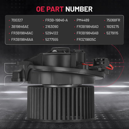 【Compatible Part Numbers】:Replacement for Blower Motor OE Number: 700327 FR3B-19846-A PM4489 75068FR 3B19846AE 2163090 FR3B19846AD 1928275 FR3B19846AC 5294122 FR3B19846AB 5279115 FR3B19846AA 5277555 FR3Z19805C.