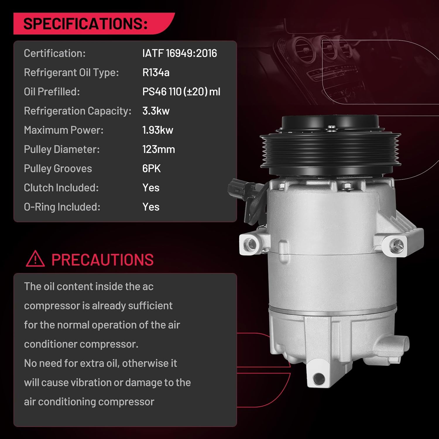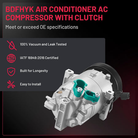 Superior Quality - The A/C Compressors for car are built in a IATF 16949:2016 Certified facility, meet or exceed OE specifications. Mechanically tested prior to leaving the factory ensures optimal performance and enhanced durability. Great life cycles.